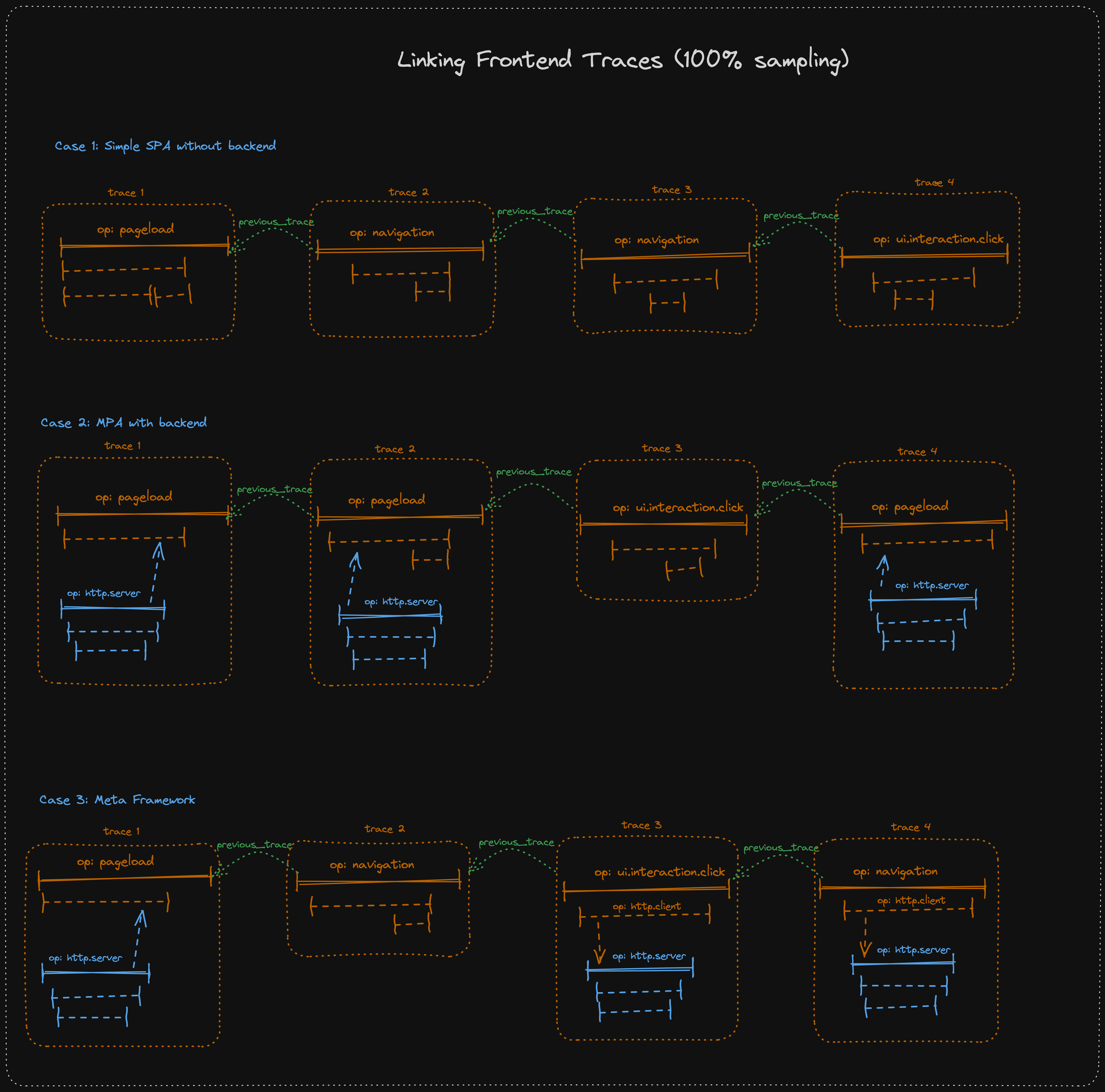 Frontend traces can be linked by adding span links between root spans. For example, a navigation span includes a link to the previous page load span.
